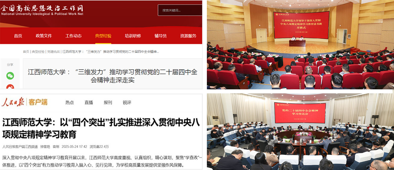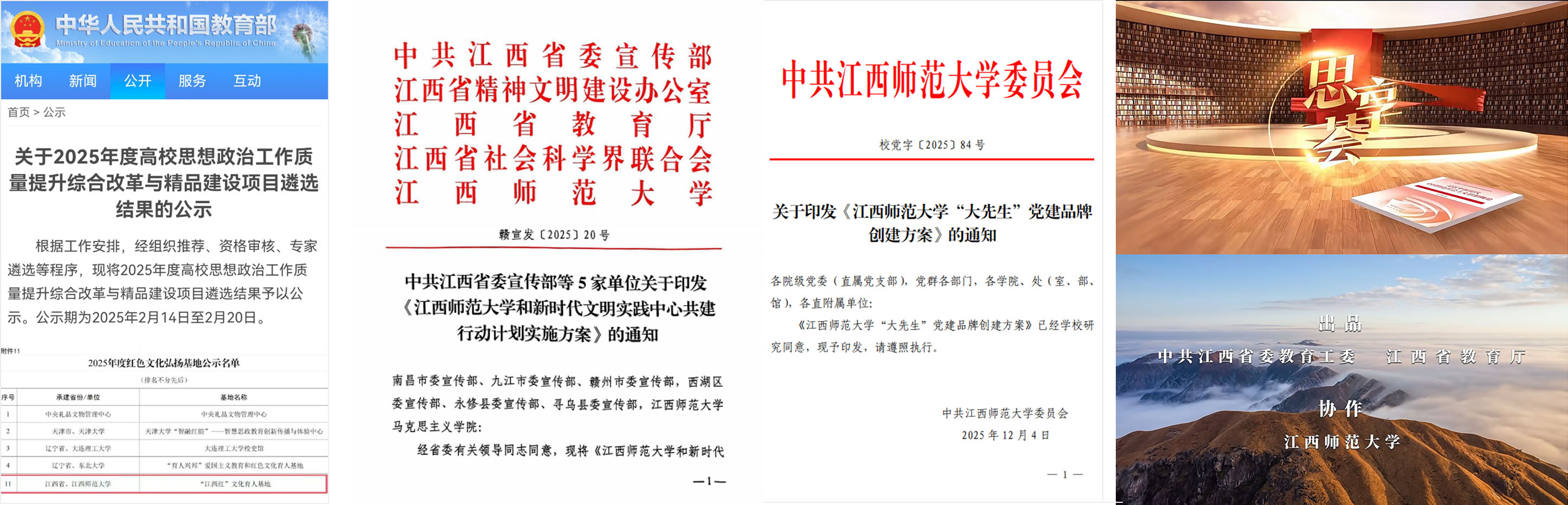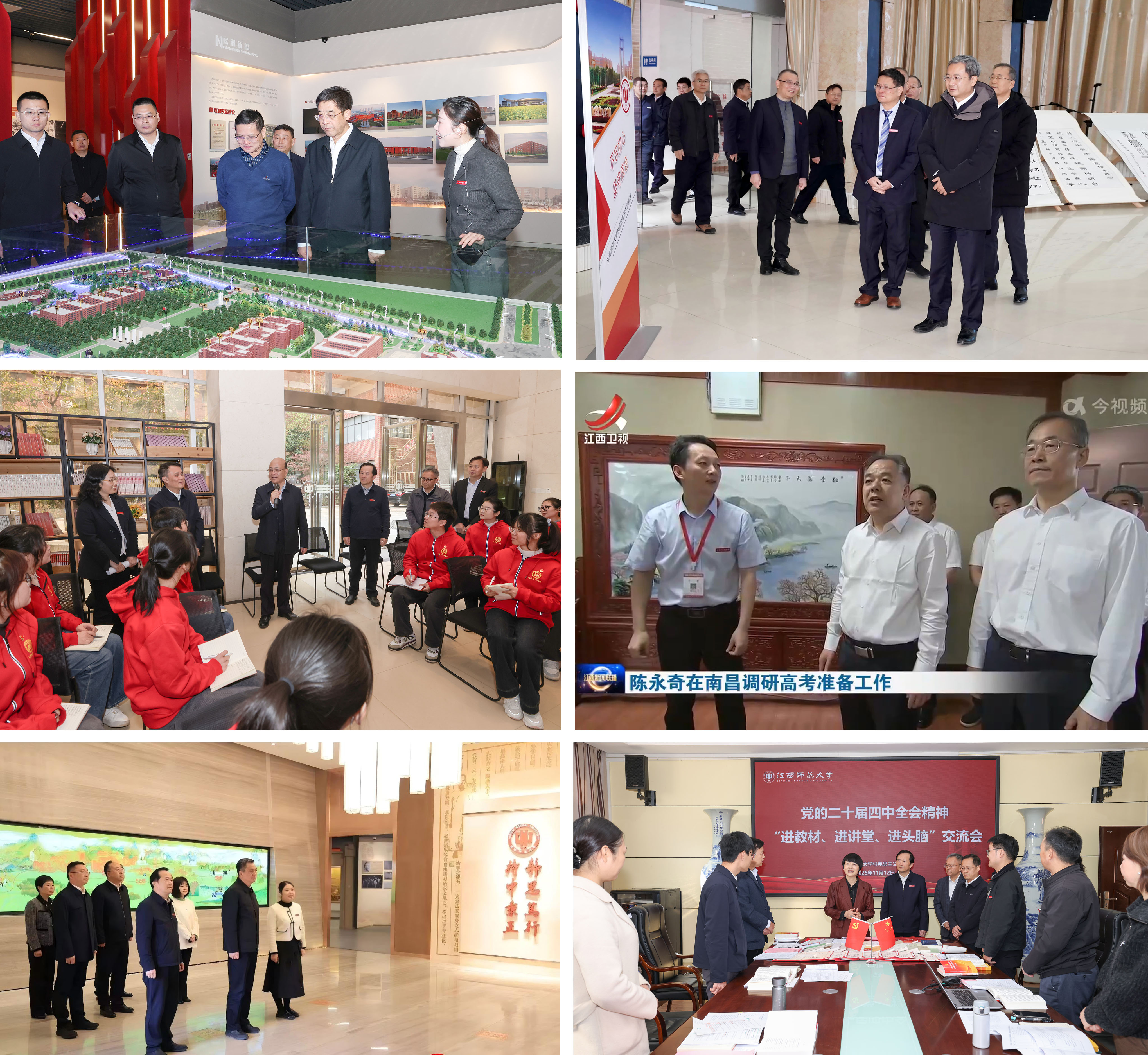 五、党建与思政工作成果丰硕 启动“大先生”党建品牌建设,实施“一院一品”党建品牌培育计划,获批全国党建研究课题,多篇党建经验入选全省典型案例,在全省教育系统党的基本知识竞赛中创近5年来最好成绩。修订完善处级、科级干部选拔任用管理办法。新闻与传播学院教师姜滨、数学与统计学院教师桂国祥获评“新时代赣鄱先锋”等荣誉称号。连续八年获评全省高校“最美辅导员”,连续四年获得教育部人文社科(高校辅导员研究专项)立项,立项总数并列全国第一。 学校入选中宣部“马克思主义学院与新时代文明实践中心共建行动”试点单位(全国20家单位,全省唯一)。省委宣传部等五个部门单位联合印发《江西师范大学新时代文明实践中心共建行动计划实施方案》。“江西红”文化育人基地获批教育部红色文化弘扬基地。协办、指导的大型专题电视片《思享荟》在江西卫视累计播出53期,全网传播量突破3亿人次,拟入选2025年度全国优秀理论宣传作品扶持计划、教育融媒体2025年度案例。