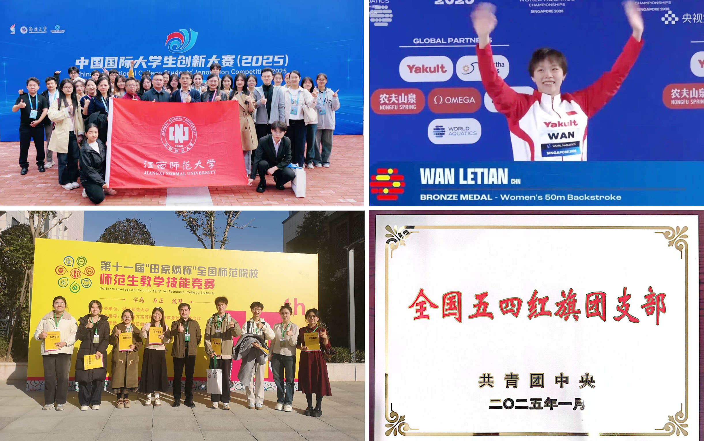 七、育人成效扎实显著 学校当选全国地方师范院校卓越教师培养联盟副理事长单位。学生荣获国家级A类竞赛最高奖项107项,同比增长57%。学生在“中国国际大学生创新大赛”中连续六年获得金奖,学校成为蝉联该项赛事金奖的全省唯一院校和全国唯一师范院校。在十一届“田家炳杯”全国师范院校师范生教学技能竞赛决赛中获一等奖3项、二等奖5项,一等奖获奖数量居全省第一,总成绩居全国前列。研究生团队在2025中国研究生创“芯”大赛·EDA精英挑战赛总决赛中获全国一等奖。体育学院万乐天、宁金霖等同学在2025年游泳世锦赛、第32届世界大学生夏季运动会、2025年亚洲竞走锦标赛等赛事中摘得3金、2银、2铜。 习近平新时代中国特色社会主义思想大学生宣讲团团支部荣获“全国五四红旗团支部”,历史文化与旅游学院沈芯同学亮相纪念中国人民抗日战争暨世界反法西斯战争胜利80周年大会阅兵式民兵方队,体育学院李丰旭同学见义勇为获评2025年下半年“江西好人”。