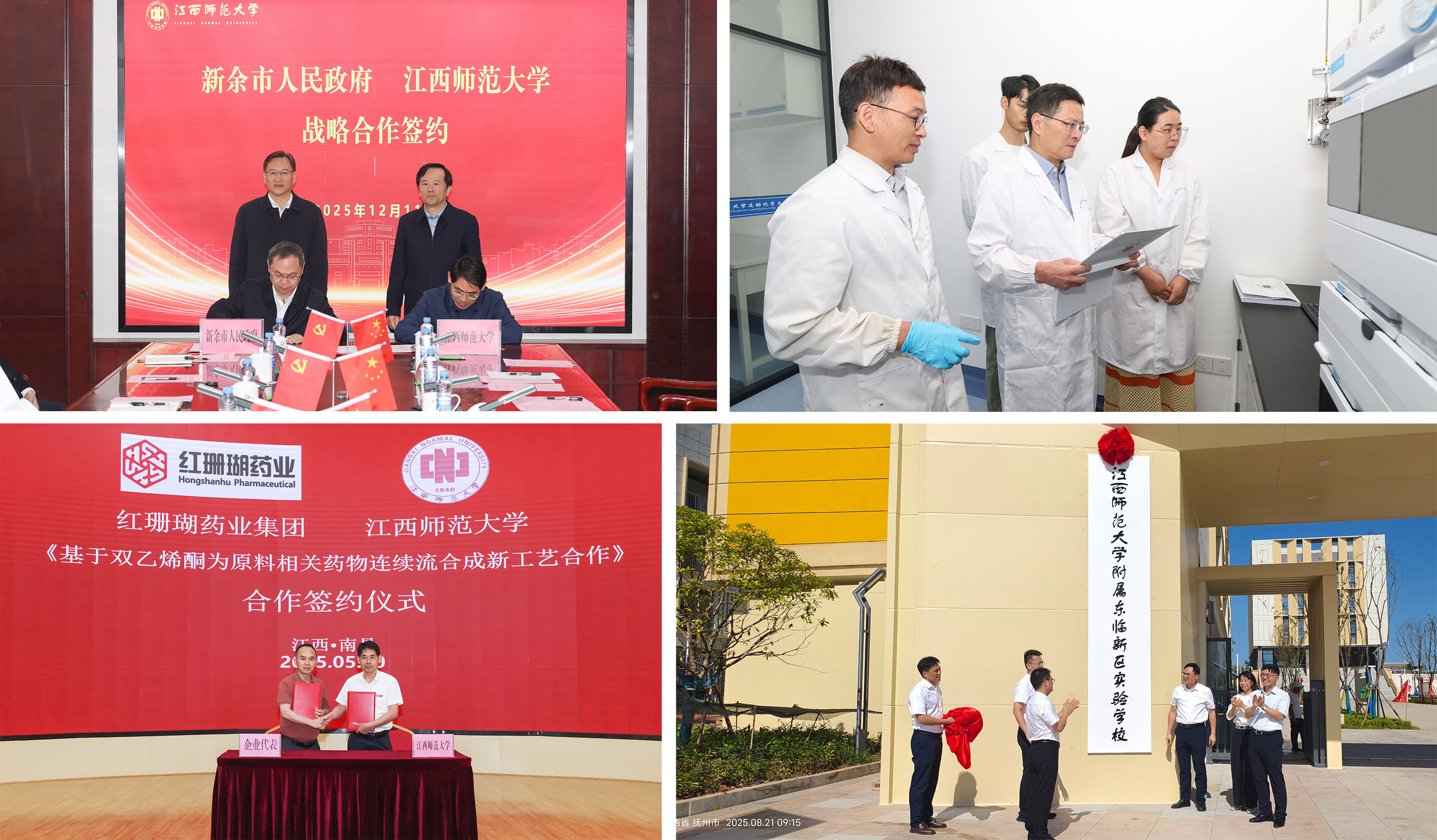 八、服务经济社会发展纵深推进 学校紧密对接江西省“1269”行动计划与六大未来产业发展方向,科技成果转化成效突出。“智能微纳连续流制造关键技术及系列工艺,引领医药化工制造划时代变革”项目入选江西省十大科技成果转化典型案例。培南类药物全连续流微纳不对称工业合成专项入选省“2030先锋工程”(全省仅8项)。举办2025年科技创新暨成果对接会,与辽宁红珊瑚药业、江西普正制药等知名企业签订成果转化协议。学校全年承接横向科研项目395项,同比增长32%,科技成果转化到账金额继续保持全省高校前列。 基础教育合作校突破20所,承办“国培”“省培”及全省市县教育局长、中小学党组织书记校长、基础教育师资硕士研究生等各类教育培训,累计教育培训近万人次。与新余市、赣州市南康区、吉安市吉水县、抚州市东临新区等地签订战略协议,在教育、人才、产业等方面开展深度合作,为推动我省基础教育普及水平和质量走在全国前列作出师大贡献。